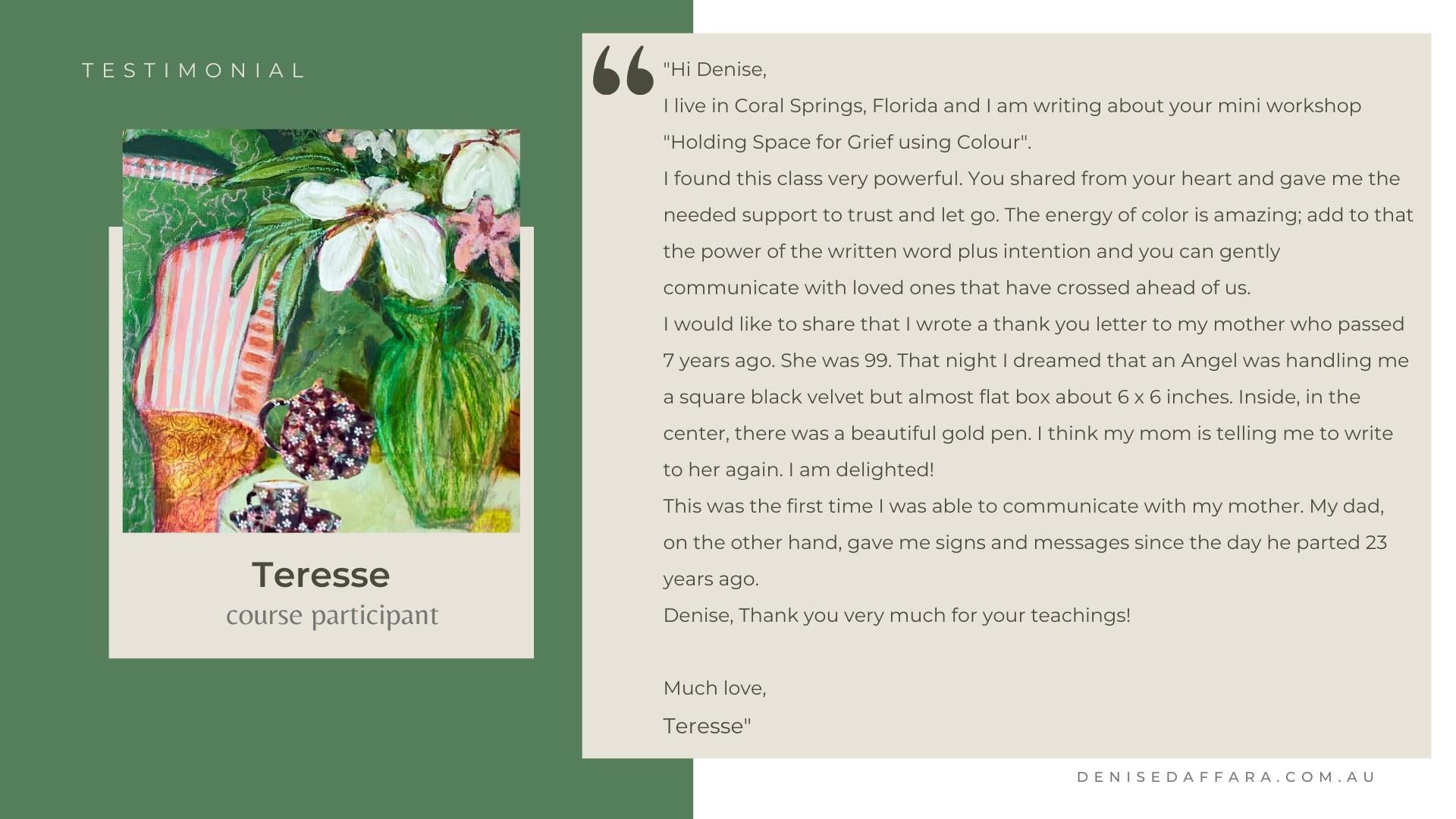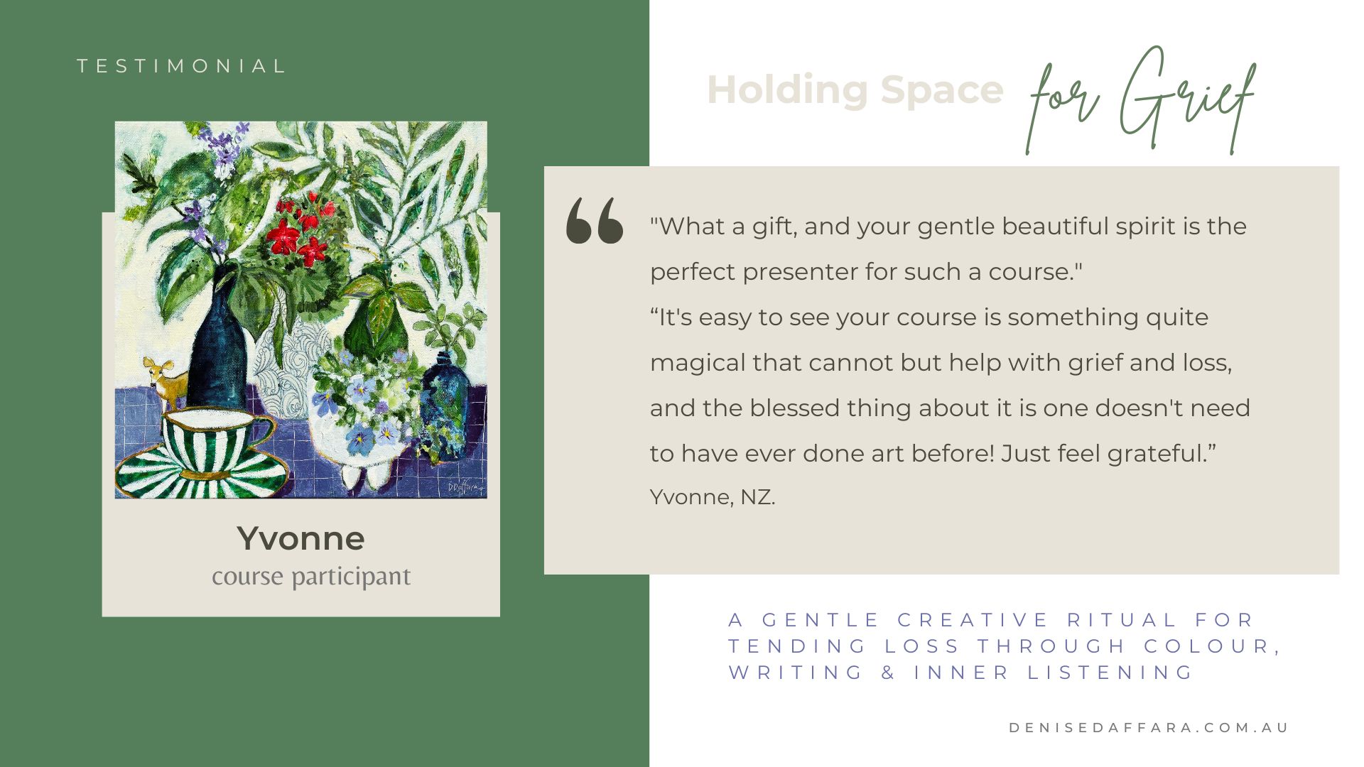 With Denise’s compassionate teaching and steady presence, you’ll move through grief-supportive prompts, painting demonstrations, and reflective writing. These practices support emotional resilience, personal meaning-making, and a deeper reconnection with yourself..